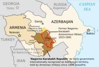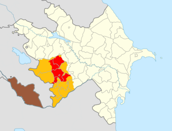 The conflict escalated into a full-scale war with the captured Shusha by Armenian forces on 9 May 1992. By 1993, the Armenian forces took control over not only the originally disputed Nagorno-Karabakh, but also several districts surrounding the region.[92] A ceasefire agreement was eventually signed on 5 May 1994 in Bishkek, Kyrgyzstan. According to Thomas de Waal, three factors contributed to the victory of the Armenian side: "Azerbaijan's political and military chaos, greater Russian support for the Armenians, and the Armenians' superior fighting skills."[93] Since the 1994 ceasefire until 2020, the Armenian Nagorno-Karabakh Republic (later Artsakh) had de facto control of the territories taken over in the war.[94]