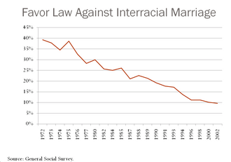 In March 2017, the Pew Research Center analysed secondary sources and conducted 1,778 phone surveys regarding how public opinion of interracial marriage has changed in the 50 years since the Loving v. Virginia decision.[10] They found that since 1990, the percent of non-black people who would oppose a relative marrying someone who is black dropped from 63% to 14%, and roughly twice the percentage of Republican/Republican-leaning respondents over Democrat/Democrat-leaning respondents said that the growth of intermarriage is a bad thing (12% to 6%), with opposition being strongest in the 65-and-older cohort (21% across both parties).