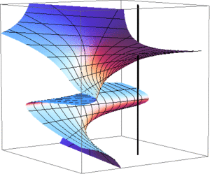 (8) illustrates the nature of the problem of finding central configurations. In the general case, one has a complicated set of algebraic equations for the configuration, \(q\ ,\) depending on the masses as parameters. The goal is to find or at least count the equivalence classes of real solutions. If we normalize \(m_3=1\) (8) becomes an equation in three variables \((m_1,m_2,r)\) defining a complicated algebraic surface shown in Figure 4. The horizontal variables are the mass parameters. Fixing \((m_1,m_2)\) defines a vertical line and Euler's CC is found by intersecting this line with the surface. It is remarkable that for \(m_i>0\), there is just one intersection.