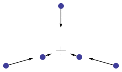 The Kepler problem describes the motion of a point particle gravitationally attracted to a mass \(\lambda\) at the origin. For example, starting with zero initial velocity, it is clear that \(r(t)\) decreases to zero in a finite time. For N=2 the corresponding homothetic solution has the two bodies approaching collision at the origin along straight lines. Such a solution is possible for every CC. For example, if the bodies in Figure 1, Figure 2 or Figure 3 are released with zero initial velocity, they will move along the lines indicated by their acceleration vectors toward a collision at the center of mass. Figure 6 shows a homothetic solution based on Lagrange's equilateral triangle. The masses are 10, 2, 1 so the center of mass is not the center of the triangle. During the motion, the triangle remains equilateral as the bodies move along straight lines, at increasing speed, toward triple collision.