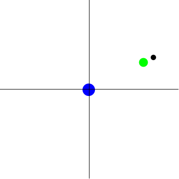 In particular, every planar CC gives rise to a family of periodic solutions of the N-body problem such that each of the bodies moves on a Keplerian elliptical orbit. As a special case, the circular Keplerian orbits give rise to a homographic solution for which the configuration just rotates rigidly at constant angular speed. This is called a relative equilibrium solution and planar CC's are often called relative equilbria (RE's). These are true equilibrium solutions in a uniformly rotating coordinate system or in a rotation-reduced system where the rotational symmetry of the N-body problem has been eliminated. Figure 7 shows a relative equilibrium solution based on one of Euler's collinear CC's for the three-body problem. The masses are 81, 1, 0.1 corresponding roughly to the Earth, Moon, and some smaller body. The small mass is permanently eclipsed by the Moon and would be invisible from the Earth.