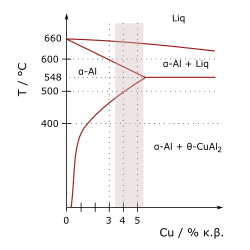 Aluminium forms a eutectic with copper at 547 °C and 33 mass percent copper, which also corresponds to the maximum solubility. At lower temperatures, the solubility drops sharply; at room temperature it is only 0.1%.