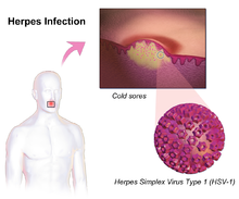 Herpes, also known as herpes simplex, is a viral infection caused by the herpes simplex virus.[1] Infections are categorized based on the part of the body infected.[5] Oral herpes involves the face or mouth.[5] It may result in small blisters in groups often called cold sores or fever blisters or may just cause a sore throat.[2][6] Genital herpes, often simply known as herpes, may have minimal symptoms or form blisters that break open and result in small ulcers.[1] These typically heal over two to four weeks.[1] Tingling or shooting pains may occur before the blisters appear.[1] Herpes cycles between periods of active disease followed by periods without symptoms.[1] The first episode is often more severe and may be associated with fever, muscle pains, swollen lymph nodes and headaches.[1] Over time, episodes of active disease decrease in frequency and severity.[1] Other disorders caused by herpes simplex include: herpetic whitlow when it involves the fingers,[7] herpes of the eye,[8] herpes infection of the brain,[9] and neonatal herpes when it affects a newborn, among others.[10]