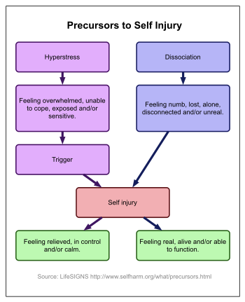 Many people who self-harm state that it allows them to "go away" or dissociate, separating the mind from feelings that are causing anguish. This may be achieved by tricking the mind into believing that the present suffering being felt is caused by the self-harm instead of the issues they were facing previously: the physical pain therefore acts as a distraction from the original emotional pain.[16] To complement this theory, one can consider the need to "stop" feeling emotional pain and mental agitation. "A person may be hyper-sensitive and overwhelmed; a great many thoughts may be revolving within their mind, and they may either become triggered or could make a decision to stop the overwhelming feelings."[48]