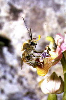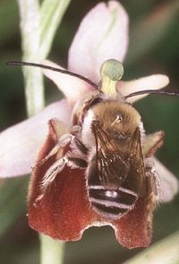 Most species of the genus Ophrys ("eyebrow") imitate the female form of their specific pollinator, usually a bee, or a wasp, sometimes a large fly, or a beetle. This visual lure is enhanced by the production of pheromones which mimic the female sex pheromones of that insect.[5]