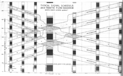 Green waves are sometimes used to facilitate bicycle traffic. Copenhagen,[4] Amsterdam,[5] San Francisco ,[6] and other cities may synchronize traffic signals to provide a green light for a flow of cyclists. On San Francisco's Valencia Street, the signals were retimed in early 2009 to provide a green wave in both directions, possibly the first street in the world with a two-way green wave for cyclists. In Copenhagen, a green wave on the arterial street Nørrebrogade facilitates 30,000 cyclists to maintain a speed of 20 km/h (12 mph) for 2.5 km (1.6 mi). In Amsterdam, cyclists riding at a speed of 15 to 18 km/h (9.3 to 11.2 mph) will be able to travel without being stopped by a red signal. Tests show that public transport can benefit as well and cars may travel slightly slower.