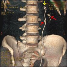 Ureteroscopy has become increasingly popular as flexible and rigid fiberoptic ureteroscopes have become smaller. One ureteroscopic technique involves the placement of a ureteral stent (a small tube extending from the bladder, up the ureter and into the kidney) to provide immediate relief of an obstructed kidney. Stent placement can be useful for saving a kidney at risk for postrenal acute kidney failure due to the increased hydrostatic pressure, swelling and infection (pyelonephritis and pyonephrosis) caused by an obstructing stone. Ureteral stents vary in length from 24 to 30 cm (9.4 to 11.8 in) and most have a shape commonly referred to as a "double-J" or "double pigtail", because of the curl at both ends. They are designed to allow urine to flow past an obstruction in the ureter. They may be retained in the ureter for days to weeks as infections resolve and as stones are dissolved or fragmented by ESWL or by some other treatment. The stents dilate the ureters, which can facilitate instrumentation, and they also provide a clear landmark to aid in the visualization of the ureters and any associated stones on radiographic examinations. The presence of indwelling ureteral stents may cause minimal to moderate discomfort, frequency or urgency incontinence, and infection, which in general resolves on removal. Most ureteral stents can be removed cystoscopically during an office visit under topical anesthesia after resolution of urolithiasis.[114] Research is currently uncertain if placing a temporary stent during ureteroscopy leads to different outcomes than not placing a stent in terms of number of hospital visits for post operative problems, short or long term pain, need for narcotic pain medication, risk of UTI, need for a repeat procedure or narrowing of the ureter from scarring.[115]