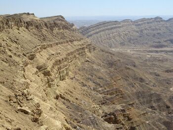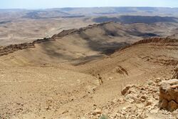 The center of the Negev is dominated by northeast-southwest anticlinal ridges. The crests of four ridges host five deep valleys surrounded by steep walls. The upper half consists of hard limestone and dolomite, and the bottom of friable sandstone. Each valley, known as a makhtesh, is drained by a narrow river bed.[4]