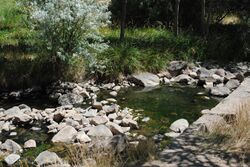 The hot spring water emerges from the ground at 138°F (59°C).[9] The water temperatures of the soaking pools varies from 94°F to 120°F.[6][3] The source of the spring water issues from fractured rocks at the intersection where the Gallinas River crosses the Montezuma Fault.[2]