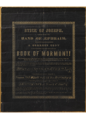 In 1844, Church of Jesus Christ of Latter Day Saints published a broadside about the Book of Mormon called "The Stick of Joseph" that reprinted some "reformed Egyptian" characters that resemble those on the first three lines of the "Caractors" document. The broadside said that the characters were those that had been shown to Anthon.[13] But it is unlikely that the characters on the broadside came directly from the "Caractors" document because Whitmer was excommunicated in 1838 and took his papers with him.[14]