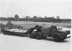 At this time, the intention was that the even heavier Conqueror tank would be transported by a whole new transporter of equally large capacity, the Leyland FV 1000.[4] This was 2 feet (61 cm) wider than the Antar, as the Antar had in turn been 2 feet (61 cm) wider than the Diamond T. They were to be equipped with a semi-trailer of 60 tons capacity, given the design number FV 3301. This design was ungainly and top-heavy when loaded, being high at the rear to clear the wheels and sloping downwards towards the front to better place the weight of the load.