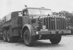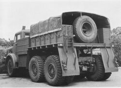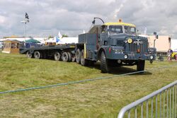 The civilian version of the Mighty Antar was developed in the late 1940s as an oilfield vehicle for transporting pipes over rough ground.[1] They were of 6×4 layout (i.e. six wheels, four of them driven), with the front (steering) axle undriven and with twin wheels on both driven (rear) axles (technically ten wheels, eight of them driven, as each rear axle has four wheels). The vehicle was designed for cross-country use, like the earlier Scammell Pioneer and unlike the road-going Diamond T it was eventually to replace.