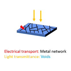 Randomly conducting networks of wires or metal meshes obtained from templates are new generation transparent electrodes. In these electrodes, nanowire or metal mesh network is charge collector, while the voids between them are transparent to light.[39] These are obtained from the deposition of silver or copper nanowires, or by depositing metals in templates such as hierarchical patterns of random cracks, leaves venation and grain boundaries etc. These metal networks can be made on flexible substrates and can act as flexible transparent electrodes.[40] For better performance of these conducting network based electrodes, optimised density of nanowires has to be used as excess density, leads to shadowing losses in solar cells, while the lower density of the wires, leads to higher sheet resistance and more recombination losses of charge carriers generated in solar cells.[41][42]
