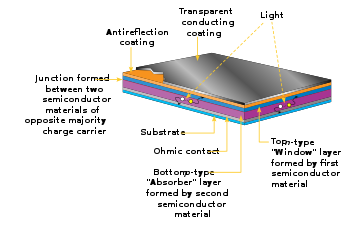 Doped metal oxides for use as transparent conducting layers in photovoltaic devices are typically grown on a glass substrate. This glass substrate, apart from providing a support that the oxide can grow on, has the additional benefit of blocking most infrared wavelengths greater than 2 μm for most silicates, and converting it to heat in the glass layer. This in turn helps maintain a low temperature of the active region of the solar cell, which degrades in performance as it heats up. TCO films can be deposited on a substrate through various deposition methods, including metal organic chemical vapor deposition, metal organic molecular beam deposition, solution deposition, spray pyrolysis, ultrasonic nozzle sprayed graphene oxide and air sprayed Ag Nanowire [19] and pulsed laser deposition (PLD), however conventional fabrication techniques typically involve magnetron sputtering of the film. The sputtering process is very inefficient, with only 30% of planar target material available for deposition on the substrate. Cylindrical targets offer closer to 80% utilization. In the case of ITO recycling of unused target material is required for economic production. For AZO or ZnAl sputtering target material is sufficiently inexpensive that recovery of materials use is of no concern. There is some concern that there is a physical limit to the available indium for ITO.[20] Growth typically is performed in a reducing environment to compensating acceptor defects within the film (e.g. metal vacancies), which degrade the carrier concentration (if n-type).[13]