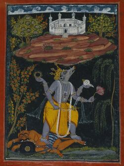 Some texts like the Vishnu Purana,[54] the Matsya Purana,[86] the Harivamsa[87] and the Padma Purana[88] contain a panegyric – dedicated to Varaha – and a plea of rescue by the earth. They clearly identify Varaha with Vishnu at this stage. Further in the Brahmanda Purana and other texts, Varaha rose from the waters carrying the earth on his tusks and restored her on the waters, where she floated like a boat. Varaha flattened the earth and divided it into seven great portions by creating mountains.[54][55][50][89][90] Further, Brahma, identified with Vishnu, creates natural features like mountains, rivers, oceans, various worlds as well as various beings.[91][92][89][75][93] The Venkatacala Mahatmya and the first account in the Bhagavata Purana mentions only the rescue of the earth by Varaha, omitting the creation activities attributed to him in other texts. The Venkatacala Mahatmya states that Varaha placed beneath the earth the world elephants, the serpent Shesha and the world turtle as support. At his behest, Brahma creates various beings. The Bhagavata Purana alludes to the slaying of a demon – identified with Hiranyaksha in other narratives in the Purana.[94][95]