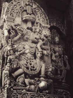 Another legend in the minor Purana named Kalika Purana also depicts the sectarian conflicts between the Vaishnava followers of Vishnu and the Shaiva sect of Shiva.[17] Varaha lifts the sunken earth by piercing his tusk through her. He then assumes the form of the seven-hooded serpent Shesha (Ananta) and supports the earth on one of his hoods. Thereafter, Varaha and Bhudevi enjoy as Varaha and Varahi. They have three boar sons named Suvrtta, Kanaka, and Ghora. Varaha and his progeny create mayhem in the world. The gods go to Varaha to abandon his boar form. Vishnu requests Shiva to take the form of Sharabha (also called Varaha Shiva), to kill the body of Varaha and the three sources of havoc. The retinues of Sharabha and Varaha, aided by Narasimha, fight. In the war, Narasimha is killed by Sarabha. Thereafter, Varaha requests Sarabha to dismember him and create implements of sacrifice from his body parts; Sharabha complies by slaying Varaha.[17][150]