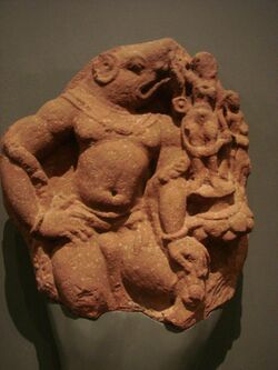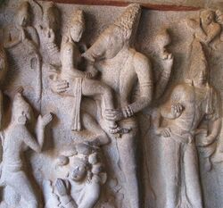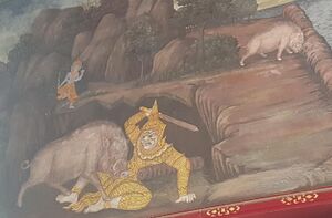 The Agni Purana mentions the obliteration of the demon Hiranyaksha as Varaha's main purpose.[81] The Linga Purana and the Kurma Purana narrate that the daitya (demon; lit. "son of Diti") Hiranyaksa defeats the gods and entraps the earth in the subterranean realm. Taking the Varaha form, Vishnu slays the demon by piercing him by his tusks. Later, he uplifts the earth from the netherworld and restores her to her original position.[100][101][102] The Linga Purana continues further: Later, Vishnu discards his boar body and returns to his heavenly abode; the earth cannot bear the weight of his tusk. Shiva relieves the earth by using the same as an ornament.[101][102]