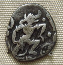 The Chalukya dynasty (543–753) was the first dynasty to adopt Varaha in their crest and minted coins with Varaha on it.[185] The Gurjara-Pratihara king Mihira Bhoja (836–885 CE) assumed the title of Adi-varaha and also minted coins depicting the Varaha image.[17] Varaha was also adopted as a part of royal insignia by the Chola (4th century BCE–1279 CE) and Vijayanagara Empires (1336–1646 CE) of South India.[175] In Karnataka, a zoomorphic image of Varaha is found in a carving on a pillar in Aihole, which is interpreted as the Vijayanagara emblem, as it is seen along with signs of a cross marked Sun, a disc and a conch.[170]