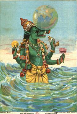 Various holy books state that the boar form was taken to rescue the earth from the primordial waters, as the animal likes to play in the water. Wilson speculates that the legend may be an allusion to a deluge or evolution of "lacustrine" mammals in the earth's early history.[52]