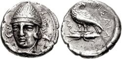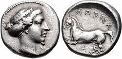 When Larissa ceased minting the federal coins it shared with other Thessalian towns and adopted its own coinage in the late fifth century BC, it chose local types for its coins. The obverse depicted the nymph of the local spring, Larissa, for whom the town was named; probably the choice was inspired by the famous coins of Kimon depicting the Syracusan nymph Arethusa. The reverse depicted a horse in various poses. The horse was an appropriate symbol of Thessaly, a land of plains, which was well known for its horses. Usually there is a male figure; he should perhaps be seen as the eponymous hero of the Thessalians, Thessalos, who is probably also to be identified on many of the earlier, federal coins of Thessaly.