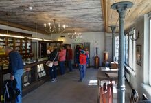 interior of an unidentified drugstore in Toledo, Ohio, United States, 1900s. A large cigar counter and a long bar with seating is featured. The photo was taken by Charles F. Mensing around 1900.