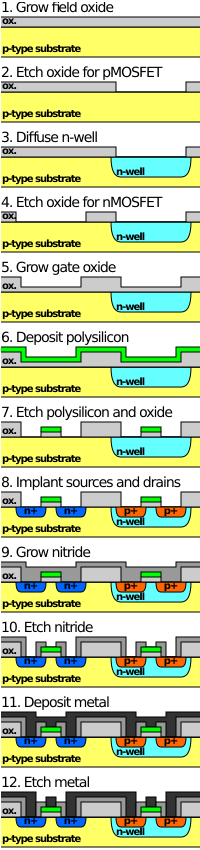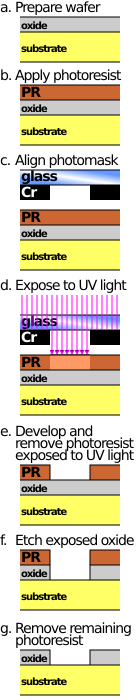 The silicon wafers start out blank and pure. The circuits are built in layers in clean rooms. First, photoresist patterns are photo-masked in micrometer detail onto the wafers' surface. The wafers are then exposed to short-wave ultraviolet light and the unexposed areas are thus etched away and cleaned. Hot chemical vapors are deposited on to the desired zones and baked in high heat, which permeate the vapors into the desired zones. In some cases, ions, such as O2+ or O+, are implanted in precise patterns and at a specific depth by using RF-driven ion sources.
