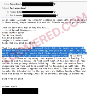 On October 10, 2010, Hunter Biden emailed Arlene Busch, a partner at Rosemont Seneca, the firm set up to sell access and influence to Vice President Joe Biden. The subject of the email was his relationship with Chris Kelly, Mark Zuckerberg's right-hand-man.