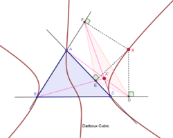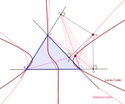 The Darboux cubic is the locus of a point X such that X* is on the line LX, where L is the de Longchamps point. Also, this cubic is the locus of X such that the pedal triangle of X is the cevian triangle of some point (which lies on the Lucas cubic). Also, this cubic is the locus of a point X such that the pedal triangle of X and the anticevian triangle of X are perspective; the perspector lies on the Thomson cubic.