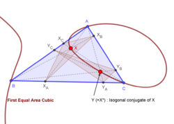 For any point [math]\displaystyle{ X = x:y:z }[/math] (trilinears), let [math]\displaystyle{ X_Y = y:z:x }[/math] and [math]\displaystyle{ X_Z = z:x:y. }[/math] The 2nd equal areas cubic is the locus of X such that the area of the cevian triangle of XY equals the area of the cevian triangle of XZ.