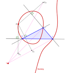 The Neuberg cubic (named after Joseph Jean Baptiste Neuberg) is the locus of a point X such that X* is on the line EX, where E is the Euler infinity point (X(30) in the Encyclopedia of Triangle Centers). Also, this cubic is the locus of X such that the triangle △XAXBXC is perspective to △ABC, where △XAXBXC is the reflection of X in the lines BC, CA, AB, respectively