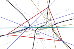 Suppose that △ABC is a triangle with sidelengths [math]\displaystyle{ a = |BC|, }[/math] [math]\displaystyle{ b = |CA|, }[/math] [math]\displaystyle{ c = |AB|. }[/math] Relative to △ABC, many named cubics pass through well-known points. Examples shown below use two kinds of homogeneous coordinates: trilinear and barycentric.