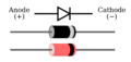 From Handwiki ![]() Close-up view of a silicon diode. The anode is on the right side; the cathode is on the left side (where it is marked with a black band). The square silicon crystal can be seen between the two leads. | |