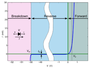 A diode's current–voltage characteristic can be approximated by four operating regions. From lower to higher bias voltages, these are: