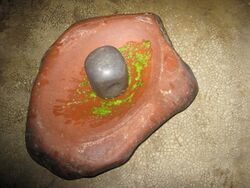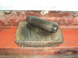 It is also used in India in a large number of households.[3] It is known there as "sil-batta" in Hindi with sil referring to flat stone and batta referring to a cylindrical grinding stone. It is known as pata-varvanta in Marathi[4] and used in the state of Maharashtra. It is known as ammi kallu in Tamil[5] and Malayalam.[6] It is known as "shil nora" in Bengali and is basically found to be used in almost every household in West Bengal. In Odisha, it is called sila puaa where it is also worshipped as Bhu Devi or mother Earth during traditional Odia weddings and the Raja festival. It is traditionally used to grind spices and lentils in the states of Tamil Nadu and Kerala. These grinding stones are primarily used to prepare chutney and spice mixes for cooking and occasional use including grinding soaked lentils in preparation for dosas, vadas, or papadum.