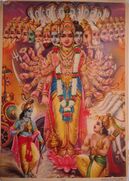 Some translators title the chapter as Vibhuti–Vistara–yoga, Religion by the Heavenly Perfections, Divine Splendor, or The Yoga of Divine Manifestations.[18][114][115] Krishna reveals his divine being in greater detail, as the ultimate cause of all material and spiritual existence, one who transcends all opposites and who is beyond any duality. Krishna says he is the atman in all beings, Arjuna's innermost Self, also compassionate Vishnu, the Surya (sun god), Indra, Shiva-Rudra, Ananta, Yama, as well as the Om, Vedic sages, time, Gayatri mantra, and the science of Self-knowledge. Arjuna accepts Krishna as the purushottama (Supreme Being).[143]
