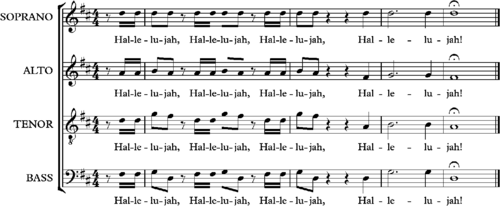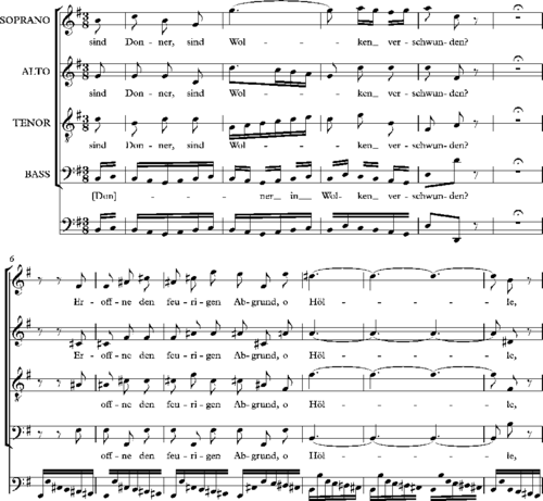 After the pause, the music continues to the words: "Open up the fiery bottomless pit, O hell!" The silence is intended to communicate a momentary sensation of terror, of staring into unfathomable darkness. Another example of a dramatic silence comes in the "rest full of tension" [16] at the climactic ending of the Hallelujah chorus in Handel's Messiah:File:Handel, Hallelujah Chorus closing bars 01.wav