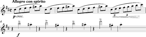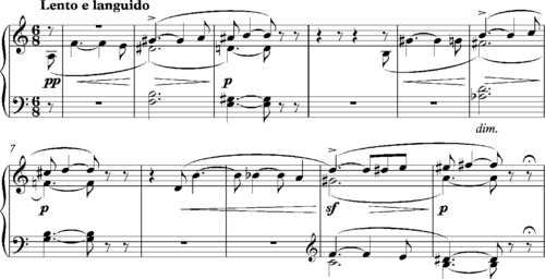 Barry Cooper (2011, p. 38) [18] writes extensively of Beethoven's many uses of silence for contemplation, for dramatic effect and especially for driving the rhythmic impetus of the music. He cites the start of the second movement of the Ninth Symphony, where the silences contribute to a powerful sense of propulsion: "The rhythm of bar 1 is incomplete and demands a note at the beginning of bar 2. The substitution of such a note by a whole-bar rest therefore gives the effect of a suppressed sound, as if one were about to speak but then refrains at the last moment. The 'suppressed sound' is then repeated in bar 4, and 'developed' (by being doubled) in bars 7 and 8." (Grove 1898) writes of the "strange irregularity of rhythm in the sixth bar" of this movement.[19] File:The opening bars of the scherzo from Beethoven's ninth symphony.wavthumb|center|500px|The opening bars of the scherzo'' from Beethoven's ninth symphony. Robert Schumann's song "Ich hab' im Traum geweinet" from his song cycle Dichterliebe uses silence to convey an almost gothic ambiance, suggesting the darkness of the grave where the dreaming poet imagines his lover has been placed: "I wept in my dreams, I dreamt you were lying in your grave."