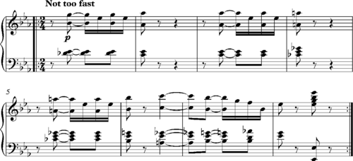 Early recordings[31] of the Rag Time Dance follow Joplin's instructions as follows: "To get the desired effect of 'Stop Time', the pianist will please stamp the heel of one foot heavily upon the floor."[32] Later recordings[33] disregard this direction – the regular beat is implied rather than stated and the silences are more palpable. Keith Swanwick (1979, p. 70) is enchanted by the "playfulness and humour" engendered by the stop-time effects in Jelly Roll Morton's solo piano recording of The Crave (1939):[34] "If we listen to this, tapping or clicking along with the beat, we shalt find ourselves surprised by two patches of silence near the end. The beat goes on but the sound stops. The effect is something like being thrown forward when a car stops suddenly. It is the biggest surprise in an engaging piece of music full of little deviations (syncopations) from the repeated beat."[35]
