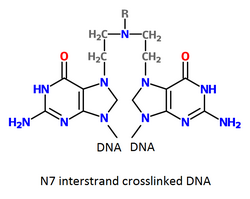 Alkylating agents are the oldest group of chemotherapeutics in use today. Originally derived from mustard gas used in World War I, there are now many types of alkylating agents in use.[4] They are so named because of their ability to alkylate many molecules, including proteins, RNA and DNA. This ability to bind covalently to DNA via their alkyl group is the primary cause for their anti-cancer effects.[37] DNA is made of two strands and the molecules may either bind twice to one strand of DNA (intrastrand crosslink) or may bind once to both strands (interstrand crosslink). If the cell tries to replicate crosslinked DNA during cell division, or tries to repair it, the DNA strands can break. This leads to a form of programmed cell death called apoptosis.[36][38] Alkylating agents will work at any point in the cell cycle and thus are known as cell cycle-independent drugs. For this reason, the effect on the cell is dose dependent; the fraction of cells that die is directly proportional to the dose of drug.[39]