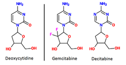 The anti-folates include methotrexate and pemetrexed. Methotrexate inhibits dihydrofolate reductase (DHFR), an enzyme that regenerates tetrahydrofolate from dihydrofolate. When the enzyme is inhibited by methotrexate, the cellular levels of folate coenzymes diminish. These are required for thymidylate and purine production, which are both essential for DNA synthesis and cell division.[6]:55–59[7]:11 Pemetrexed is another anti-metabolite that affects purine and pyrimidine production, and therefore also inhibits DNA synthesis. It primarily inhibits the enzyme thymidylate synthase, but also has effects on DHFR, aminoimidazole carboxamide ribonucleotide formyltransferase and glycinamide ribonucleotide formyltransferase.[43] The fluoropyrimidines include fluorouracil and capecitabine. Fluorouracil is a nucleobase analogue that is metabolised in cells to form at least two active products; 5-fluourouridine monophosphate (FUMP) and 5-fluoro-2'-deoxyuridine 5'-phosphate (fdUMP). FUMP becomes incorporated into RNA and fdUMP inhibits the enzyme thymidylate synthase; both of which lead to cell death.[7]:11 Capecitabine is a prodrug of 5-fluorouracil that is broken down in cells to produce the active drug.[44] The deoxynucleoside analogues include cytarabine, gemcitabine, decitabine, azacitidine, fludarabine, nelarabine, cladribine, clofarabine, and pentostatin. The thiopurines include thioguanine and mercaptopurine.[37][42]