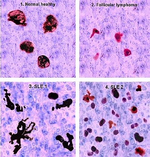 The modern period, beginning in 1920, saw major developments in research into the cause and treatment of discoid and systemic lupus. Research conducted in the 1920s and 1930s led to the first detailed pathologic descriptions of lupus and demonstrated how the disease affected the kidney, heart, and lung tissue.[120] A major breakthrough was made in 1948 with the discovery of the LE cell (the lupus erythematosus cell—a misnomer, as it occurs with other diseases as well). Discovered by a team of researchers at the Mayo Clinic, they discovered that the white blood cells contained the nucleus of another cell that was pushing against the white's cell proper nucleus.[121] Noting that the invading nucleus was coated with antibody that allowed it to be ingested by a phagocytic or scavenger cell, they named the antibody that causes one cell to ingest another the LE factor and the two nuclei cell result in the LE cell.[122] The LE cell, it was determined, was a part of an anti-nuclear antibody (ANA) reaction; the body produces antibodies against its own tissue. This discovery led to one of the first definitive tests for lupus since LE cells are found in approximately 60% of all people diagnosed with lupus.[123] The LE cell test is rarely performed as a definitive lupus test today as LE cells do not always occur in people with SLE and can occur in individuals with other autoimmune diseases. Their presence can be helpful in establishing a diagnosis but no longer indicates a definitive SLE diagnosis.