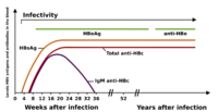 If the host is able to clear the infection, eventually the HBsAg will become undetectable and will be followed by IgG antibodies to the hepatitis B surface antigen and core antigen (anti-HBs and anti HBc IgG).[38] The time between the removal of the HBsAg and the appearance of anti-HBs is called the window period. A person negative for HBsAg but positive for anti-HBs either has cleared an infection or has been vaccinated previously.