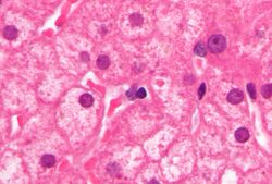 PCR tests have been developed to detect and measure the amount of HBV DNA, called the viral load, in clinical specimens. These tests are used to assess a person's infection status and to monitor treatment.[68] Individuals with high viral loads, characteristically have ground glass hepatocytes on biopsy.