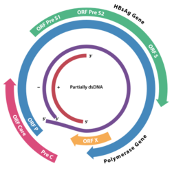 The genome of HBV is made of circular DNA, but it is unusual because the DNA is not fully double-stranded. One end of the full length strand is linked to the HBV DNA polymerase. The genome is 3020–3320 nucleotides long (for the full-length strand) and 1700–2800 nucleotides long (for the short length-strand).[42] The negative-sense (non-coding) is complementary to the viral mRNA. The viral DNA is found in the nucleus soon after infection of the cell. The partially double-stranded DNA is rendered fully double-stranded by completion of the (+) sense strand and removal of a protein molecule from the (−) sense strand and a short sequence of RNA from the (+) sense strand. Non-coding bases are removed from the ends of the (−) sense strand and the ends are rejoined. There are four known genes encoded by the genome, called C, X, P, and S. The core protein is coded for by gene C (HBcAg), and its start codon is preceded by an upstream in-frame AUG start codon from which the pre-core protein is produced. HBeAg is produced by proteolytic processing of the pre-core protein. In some rare strains of the virus known as Hepatitis B virus precore mutants, no HBeAg is present.[43] The DNA polymerase is encoded by gene P. Gene S is the gene that codes for the surface antigen (HBsAg). The HBsAg gene is one long open reading frame but contains three in frame "start" (ATG) codons that divide the gene into three sections, pre-S1, pre-S2, and S. Because of the multiple start codons, polypeptides of three different sizes called large (the order from surface to the inside: pre-S1, pre-S2, and S ), middle (pre-S2, S), and small (S)[44] are produced.[45] There is a myristyl group, which plays an important role in infection, on the amino-terminal end of the preS1 part of the large (L) protein.[46] In addition to that, N terminus of the L protein have virus attachment and capsid binding sites. Because of that, the N termini of half of the L protein molecules are positioned outside the membrane and the other half positioned inside the membrane.[47]