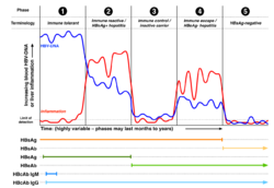 Individuals who remain HBsAg positive for at least six months are considered to be hepatitis B carriers.[66] Carriers of the virus may have chronic hepatitis B, which would be reflected by elevated serum alanine aminotransferase (ALT) levels and inflammation of the liver, if they are in the immune clearance phase of chronic infection. Carriers who have seroconverted to HBeAg negative status, in particular those who acquired the infection as adults, have very little viral multiplication and hence may be at little risk of long-term complications or of transmitting infection to others.[67] However, it is possible for individuals to enter an "immune escape" with HBeAg-negative hepatitis.