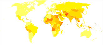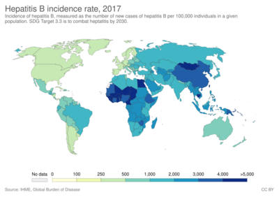 An estimated 296 million people, or 3.8% of the global population, had chronic hepatitis B infections as of 2019. Another 1.5 million developed acute infections that year, and 820,000 deaths occurred as a result of HBV.[1] Cirrhosis and liver cancer are responsible for most HBV-related deaths.[18] The disease is most prevalent in Africa (affecting 7.5% of the continent's population) and in the Western Pacific region (5.9%).[19] Infection rates are 1.5% in Europe and 0.5% in the Americas.[19] According to some estimates, about a third of the world's population has been infected with hepatitis B at one point in their lives.[18] Hepatitis B was originally known as "serum hepatitis".[20]