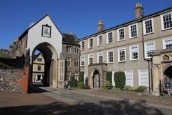St Ethelbert's Gate is one of the entrances to the south section of the Close. The room above the gateway was originally a chapel dedicated to Saint Ethelbert the King and came to be used by the school in 1944.[62] It was used as an art room before its conversion into the Barbirolli music practice room, named after Lady Barbirolli, under Philip Stibbe's headship (1975–1984), a project financed by the Dyers.[91] A scheduled monument, the gateway was built in 1316 by the citizens of Norwich as penance for a riot in 1272 which damaged many of the priory buildings.[92][93] It was substantially restored in 1815 by William Wilkins, an Old Norvicensian, and underwent further renovations in 1964 which saw the stonework and carvings replaced under the supervision of Sir Bernard Feilden. Art historian Veronica Sekules describes the St Ethelbert's Gate as it was in the 14th century as "a highly decorative building presenting a façade rich in images, which the cathedral otherwise lacked. In a sense it would have operated as a principal façade and, in as far as one can glean from the remaining images, it communicated a strong message designating the gate as the opening to hallowed ground beyond."[93]