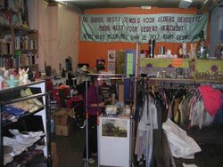 The anarchist 1960s countercultural group The Diggers[195] opened free stores which simply gave away their stock, provided free food, distributed free drugs, gave away money, organized free music concerts, and performed works of political art.[196] The Diggers took their name from the original English Diggers led by Gerrard Winstanley[197] and sought to create a mini-society free of money and capitalism.[198]