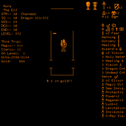 Teleporters move characters between dungeon levels. High-level monsters, including a Golden Dragon that guards the Orb, are found at the end of each dungeon. Leaving the dungeon allows one to recuperate and regain spells and return later.