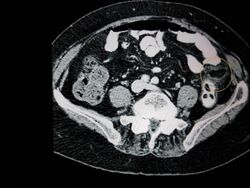 Omental infarction: Omental infarction is uncommon reason for acute abdomen. It is similar to acute appendicitis. The pain is of a few days duration centering in the right lower or upper quadrant. Imaging is required to obtain an accurate diagnosis due to the common misdiagnosis of omental infarction as appendicitis or cholecystitis. Omental infarction occurs commonly in pediatric patients approximately 15 percent of cases. The most frequent cause of non- torsion related omental infarction is due to trauma as well as thrombosis or the omental veins. The predisposition for omental infarction includes obesity, strenuous activity, congestive heart failure, digitalis administration, recent abdominal surgery and trauma.[2] "The typical CT findings are a solitary large non-enhancing omental mass with heterogeneous attenuation, which is most often located in the right lower quadrant, deep to the rectus abdominis muscle and either anterior to the transverse colon or anteromedial to the ascending colon".[2] Omental Infarction can be difficult to differentiate from diverticulitis however omental infarction is not normally attributed with bowel wall thickening. It is rare that the colonic wall will be thickened due to spread of the inflammation from the omentum (a fold of peritoneum connecting or supporting abdominal structures) to the tenia omentalis of the colon.[2]